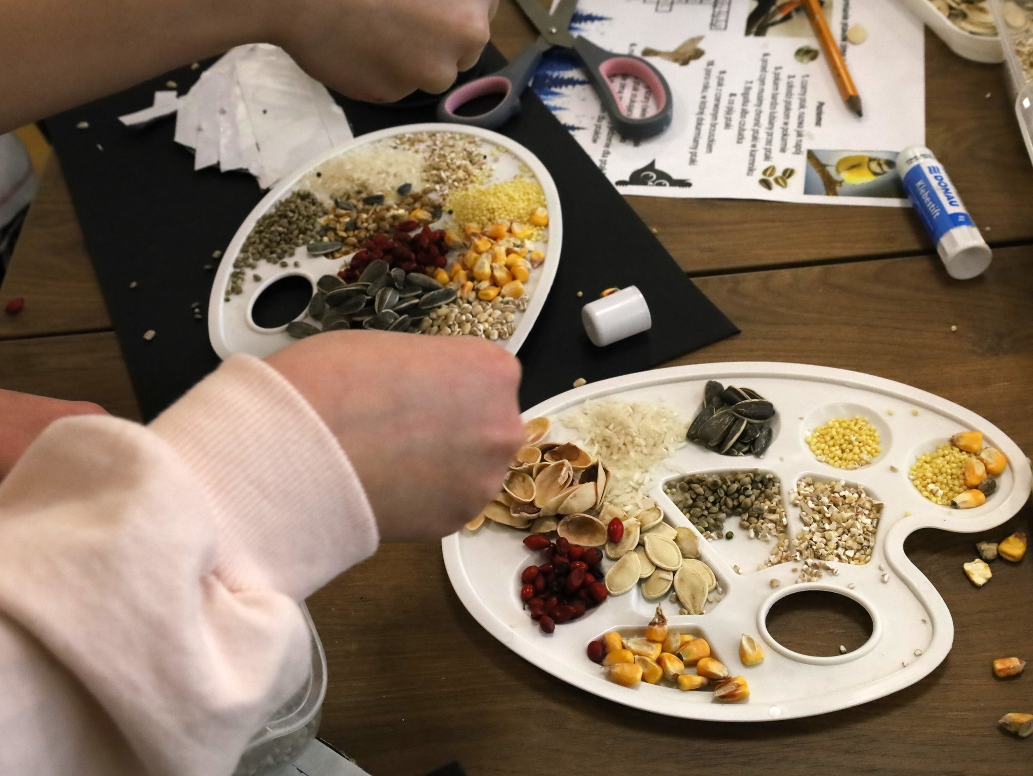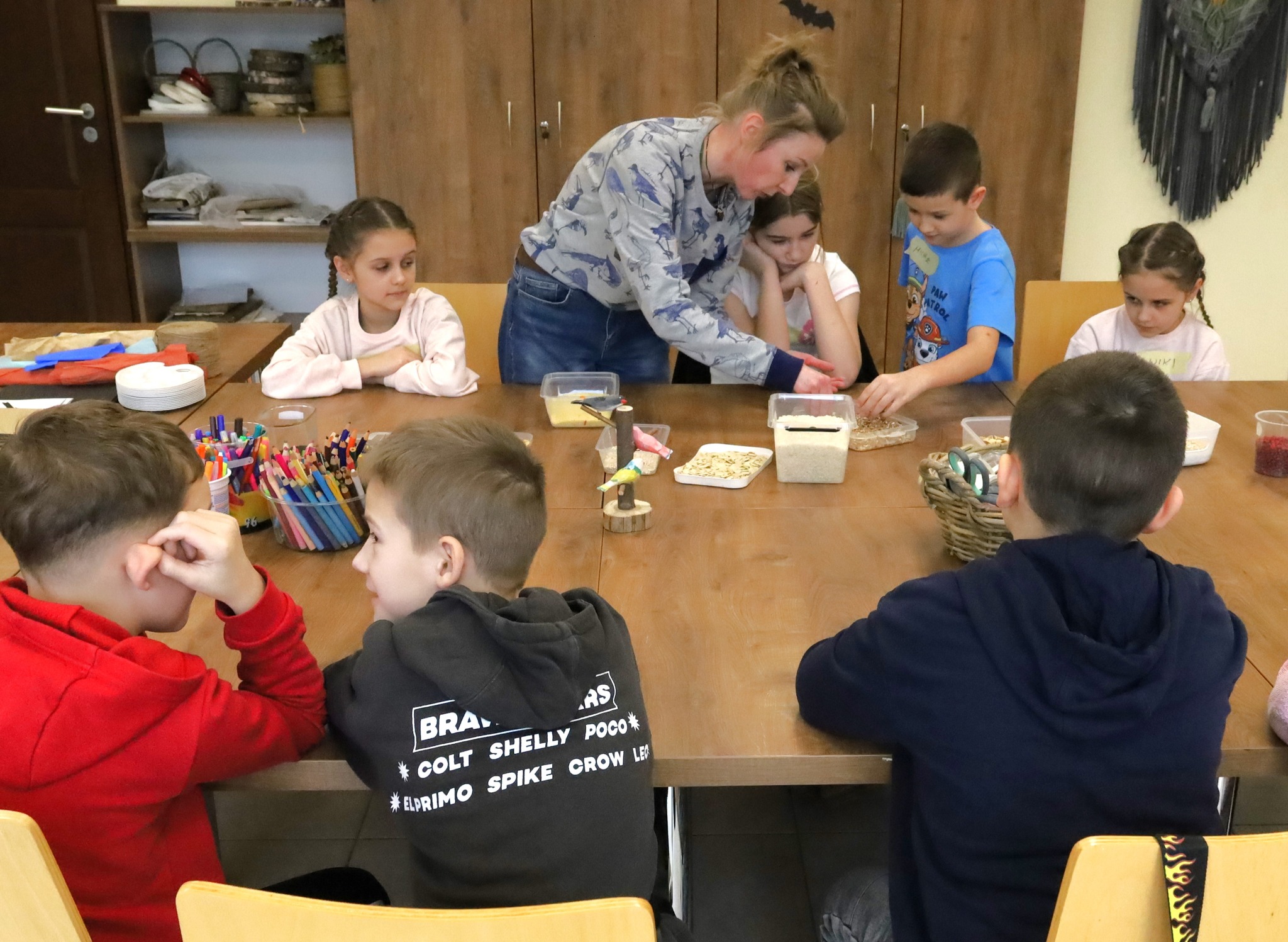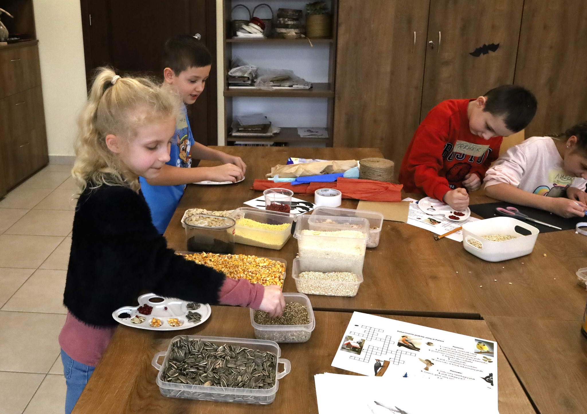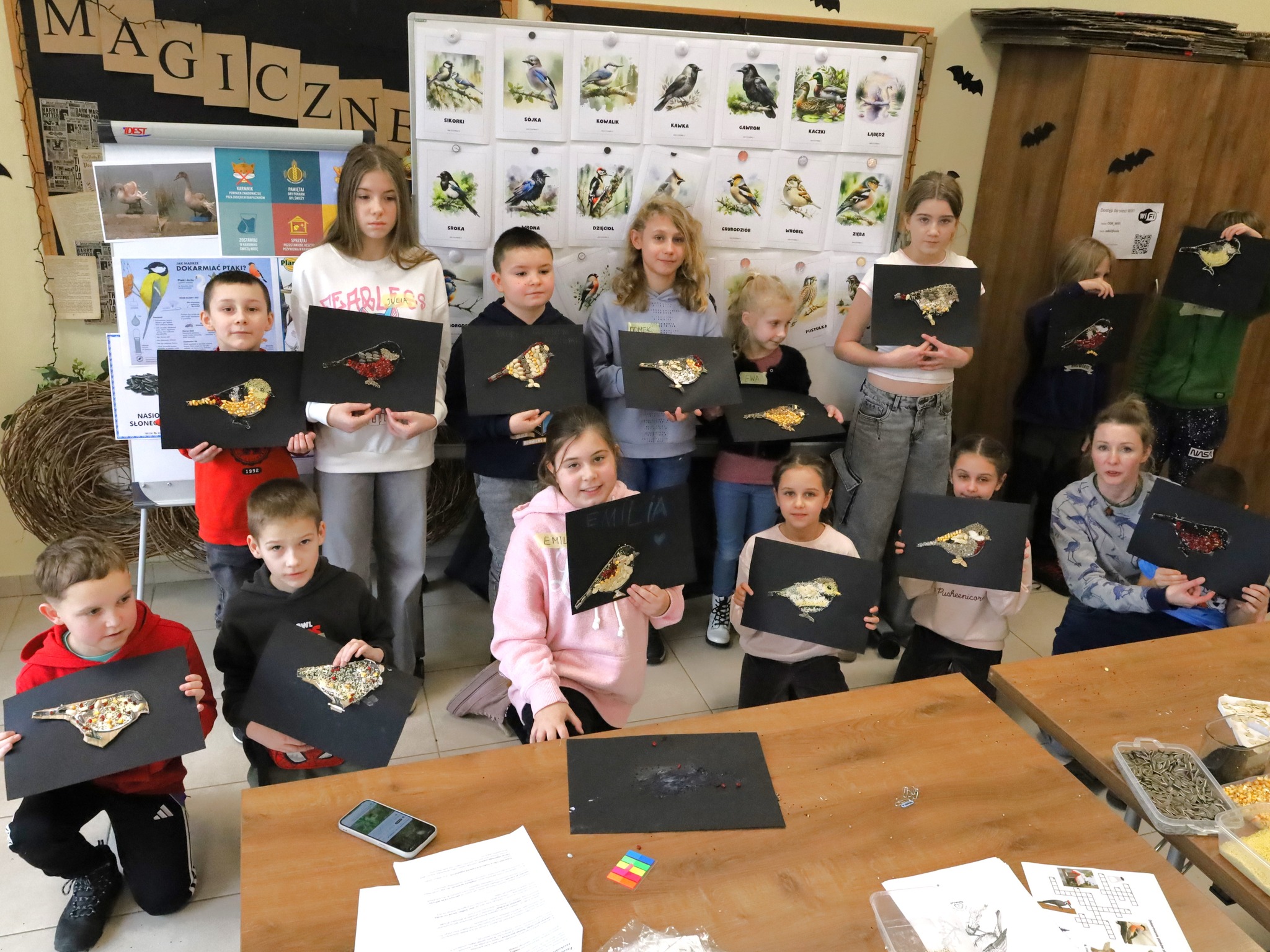 Dzieci z zaangażowaniem sprawdziły swoją wiedzę, rozwiązując ptasią krzyżówkę, a zdobyte informacje wykorzystały w części artystycznej. Powstały niezwykłe portrety tworzone z ziaren i nasion – pełne kolorów, pomysłów i dziecięcej wyobraźni.