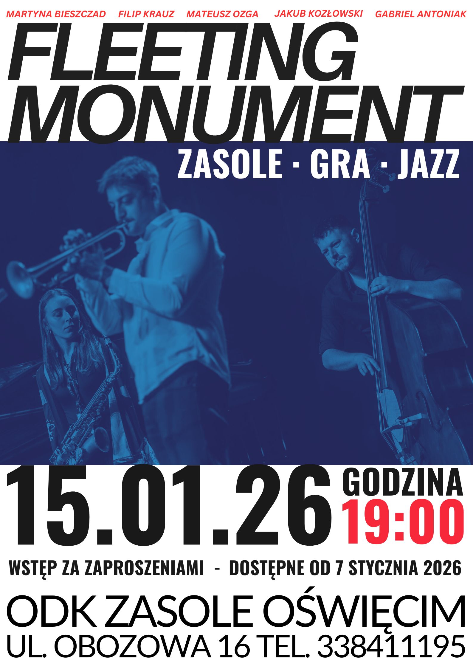 15.01.2026 godz.19.00 zapraszamy do Osiedlowego Domu Kultury Zasole w Oświęcimiu na koncert jazzowy Fleeting Monument, w ramach projektu Prezentacje z cyklu Małe formy muzyczne. Wstęp za zaproszeniami do odbioru w ODK Zasole od 7 stycznia 2026 r. Fleeting Monument: Martyna Bieszczad – saksofon, Filip Krauz – trąbka, Mateusz Ozga – fortepian, Jakub Kozłowski – kontrabas, […]