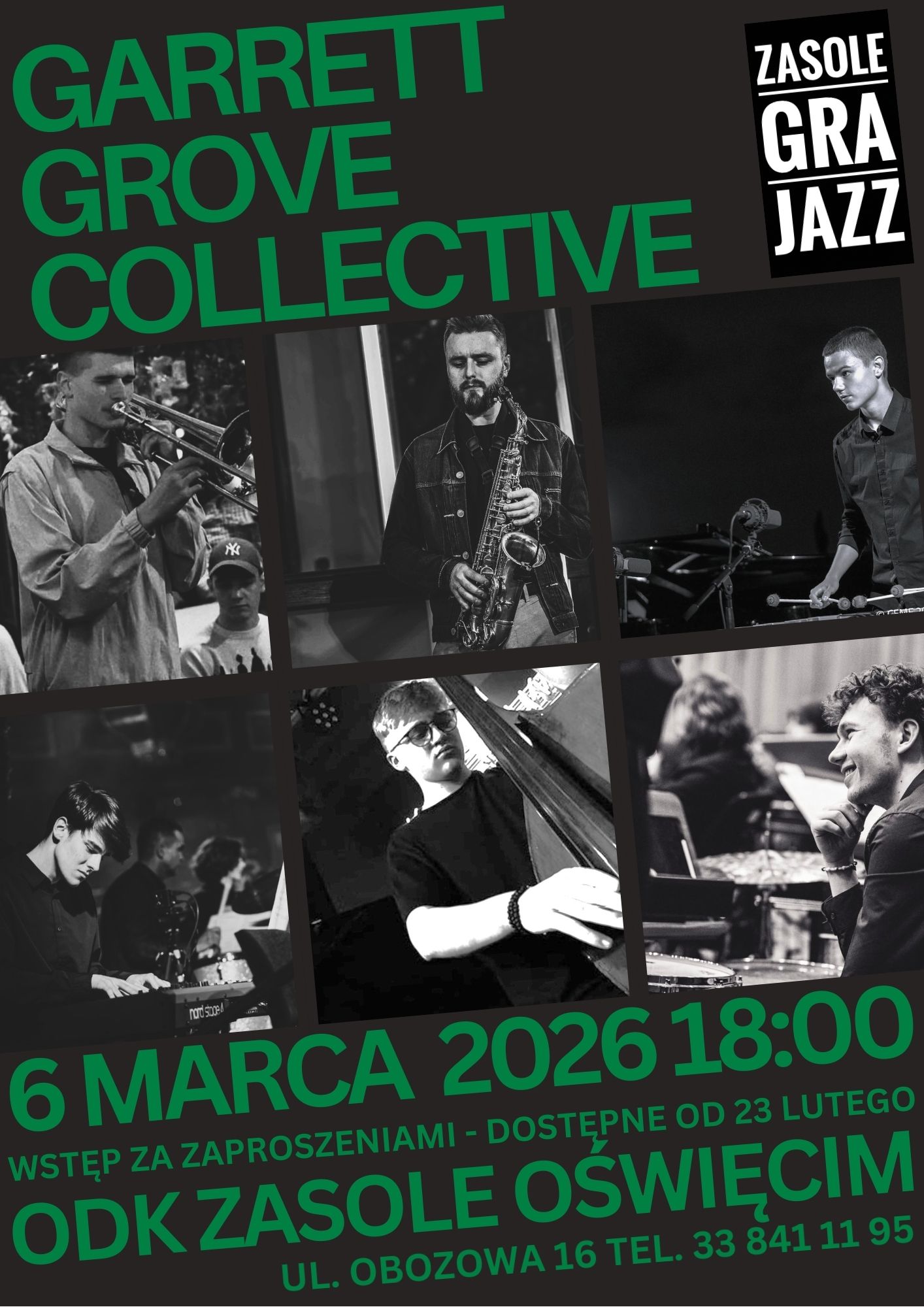6 marca 2026 roku o godz. 18.00 zapraszamy do Osiedlowego Domu Kultury Zasole w Oświęcimiu na koncert jazzowy Garrett Grove Collective, w ramach projektu Prezentacje z cyklu Małe formy muzyczne. Wstęp za zaproszeniami dostępnymi w recepcji ODK Zasole od 23 lutego 2026 roku. Ilość miejsc ograniczona, możliwość rezerwacji telefonicznej.