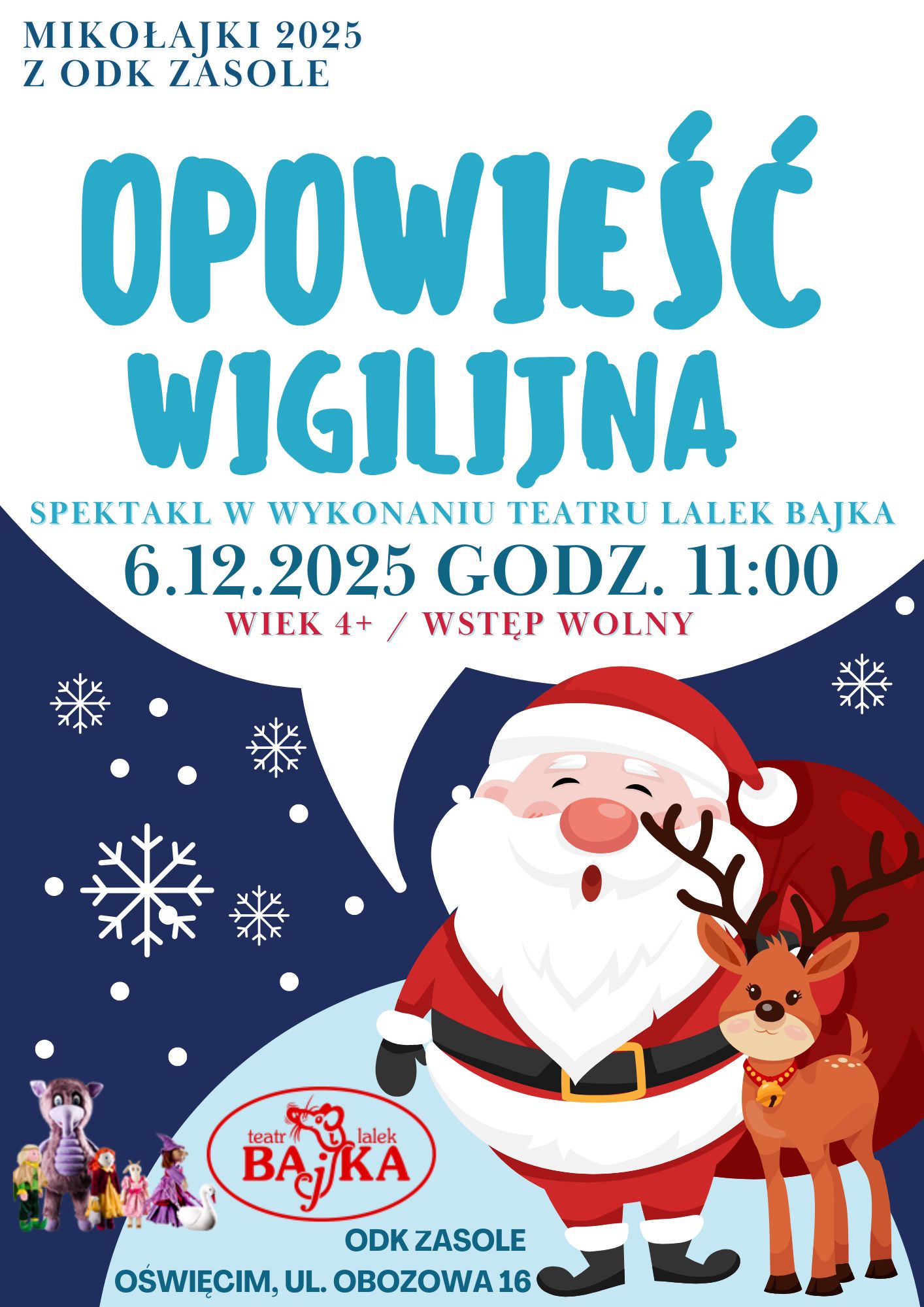 6 grudnia 2025 roku o godzinie 11:00 w Osiedlowym Domu Kultury Zasole odbędzie się spektakl mikołajkowy dla dzieci w wieku przedszkolnym i szkolnym w wykonaniu Teatru Lalek pt. „Opowieść Wigilijna’’. Projekt Integracje. Wstęp wolny. Celem bajki jest zwrócenie uwagi na relacje rodzinne i przyjacielskie, szczególnie w okresie Świąt Bożego Narodzenia. Urocza opowieść o małej Myszce […]