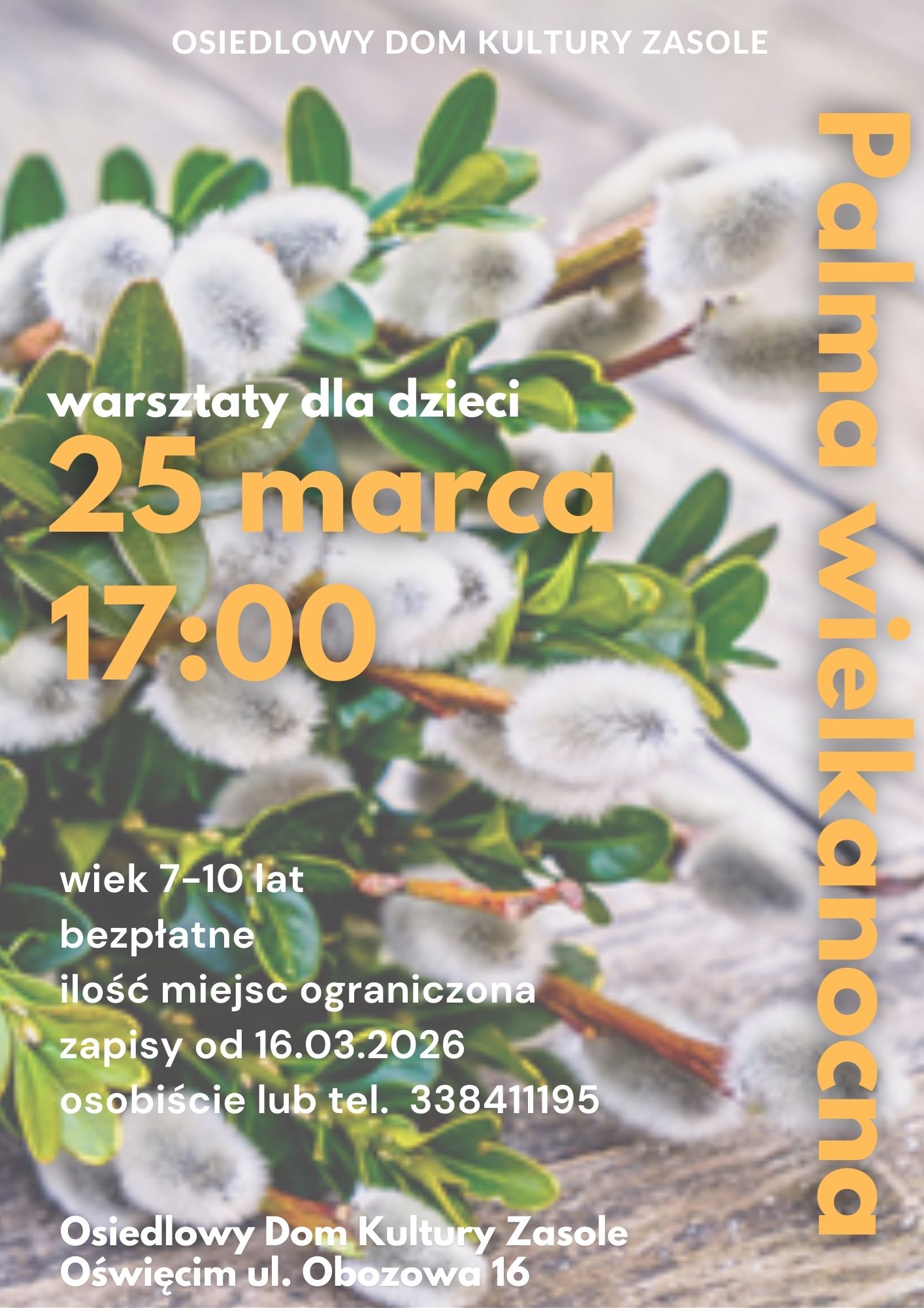 25 marca 2026 roku o godz. 17.00 zapraszamy do Osiedlowego Domu Kultury Zasole na bezpłatne warsztaty pt. „Palma wielkanocna” w ramach projektu Integracje. Warsztaty przeznaczone są dla dzieci w wieku 7–10 lat, ilość miejsc ograniczona.